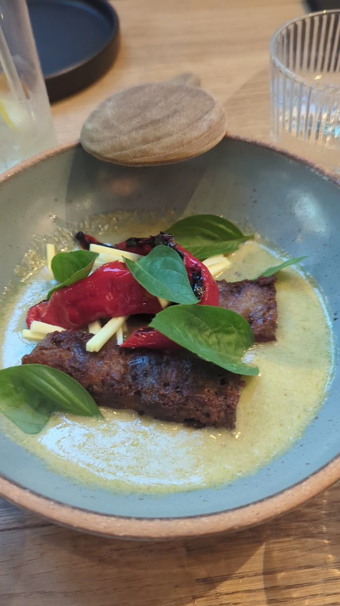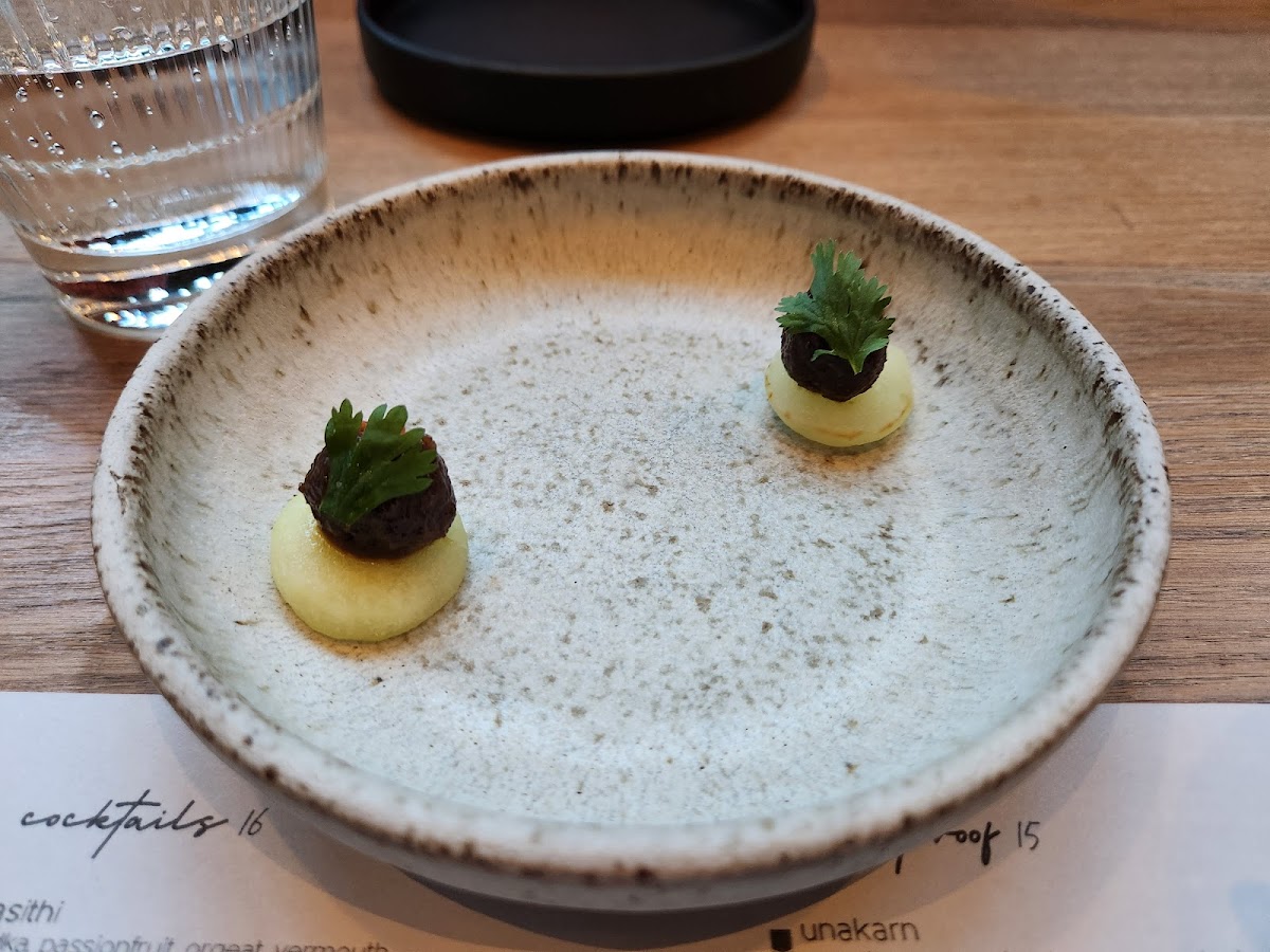 Nari has powerful flavors. It exemplifies traditional Thai spices and ingredients, a lot more orthodox than I expected, but presented in a modern fusion style. Being newly awarded a Michelin star, we walked in with high expectations. Let's get done with the amazing aspects. Modern, chic, woody atmosphere at the Kabuki Hotel. Already perfect for a date night to impress. Airy space. Contemporary decor. Soft lighting. Bustling yet not noisy ambience. Good table spacing. All amazing. And the service was fabulous. Again, everything screamed of fine dining without the unnecessary level of snootyness. The food is punchy. Every single dish can stand on its own and again, tries to scream in your mouth that they are special. Flavor layering is well done especially with the bit-sized appetizers. The sauces also play a very important role, whether they are pre-applied or poured on top of. The spice profile tries to run towards the moderate middleground but again, the chef is not compromising but rather giving you a bit of break. Otherwise, jumping from one dish to another is a powerful but taxing experience. The food is great and for the tasting menu price of $125, we think it is really well worth it. But Nari's tasting menu also highlights that more is always not necessarily better. Due to the powerful flavors, your tongue and brains get tired half-way through. There's no breather. No palate cleanser. And many of these dishes in Thai are served with rice or roti. But as a tasting menu, these neutral carbs cannot be the star of the show. Hence you get punches after punches. And then the quantity. It's just a tad bit too much. When you are trying to down a tasty curry after 6~7 courses of tasting, it just overwhelms. Either make everything bite-sized or reduce the complexity of the main course. Nari can easily take this to the next level by balancing out their course better. Every dish screams to be special, and they are. But the harmony of them put together in a sequence is where there needs to be tuning. And feel free to remove a dish or two and replace it with neutral flavors like a mild soup, etc. Finally, I higly recommend ordering a light, netrual and more earthy wine. Without it, you will really have a tough time jumping from one dish to the next. And trust me, you'll feel exhausted after you finish. It's a great experience overall. There's more that Nari can do!