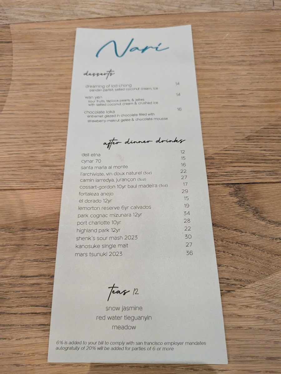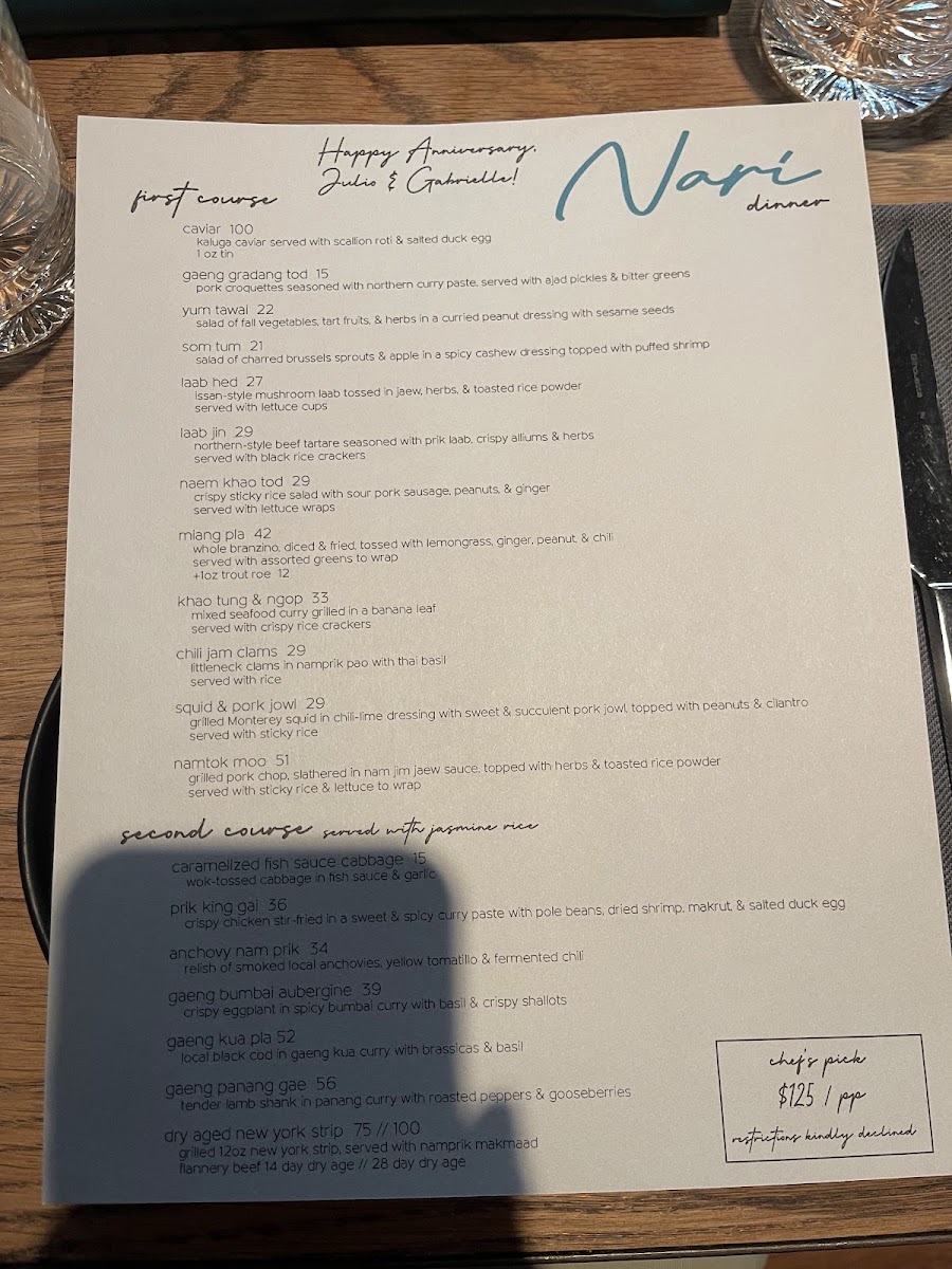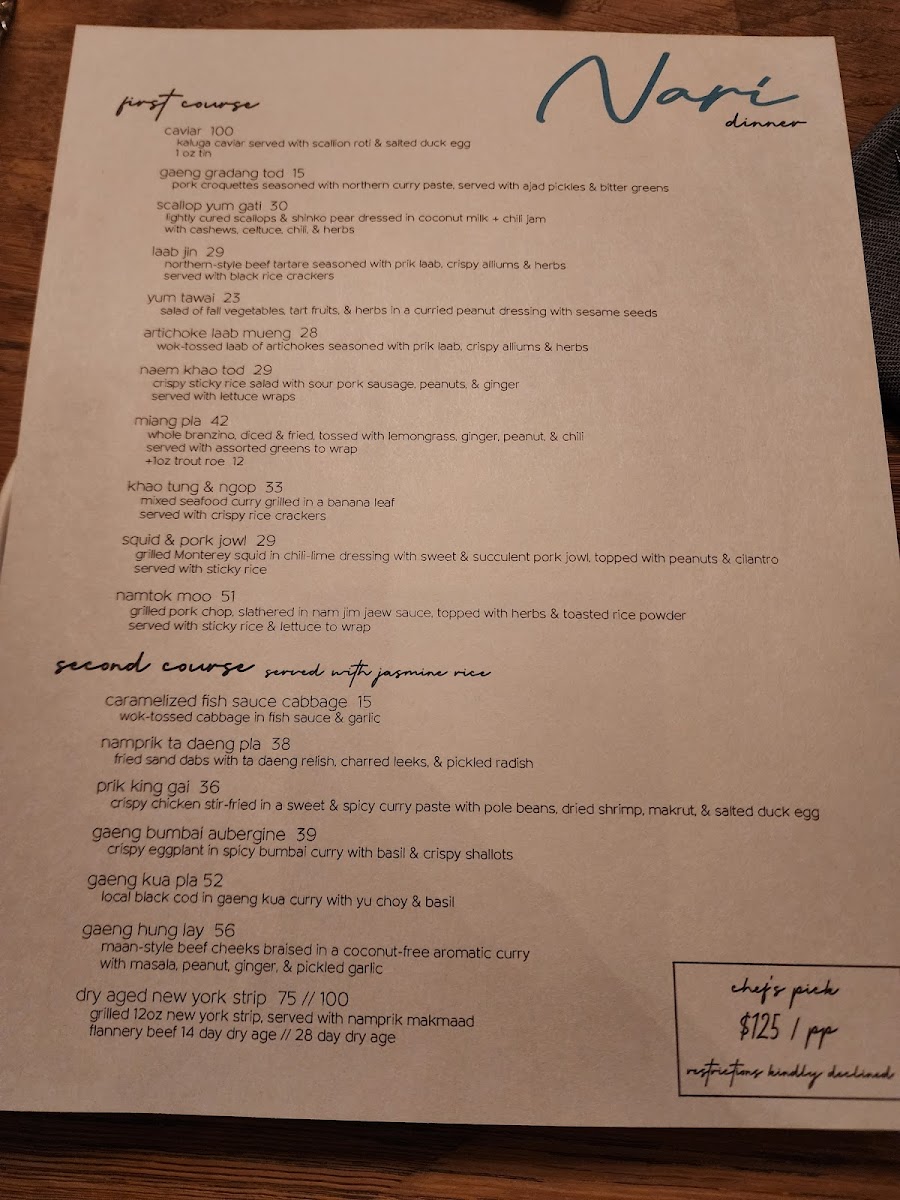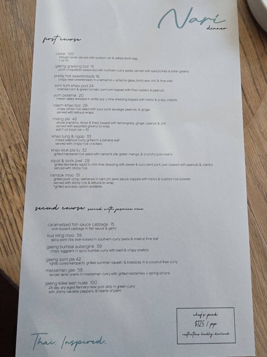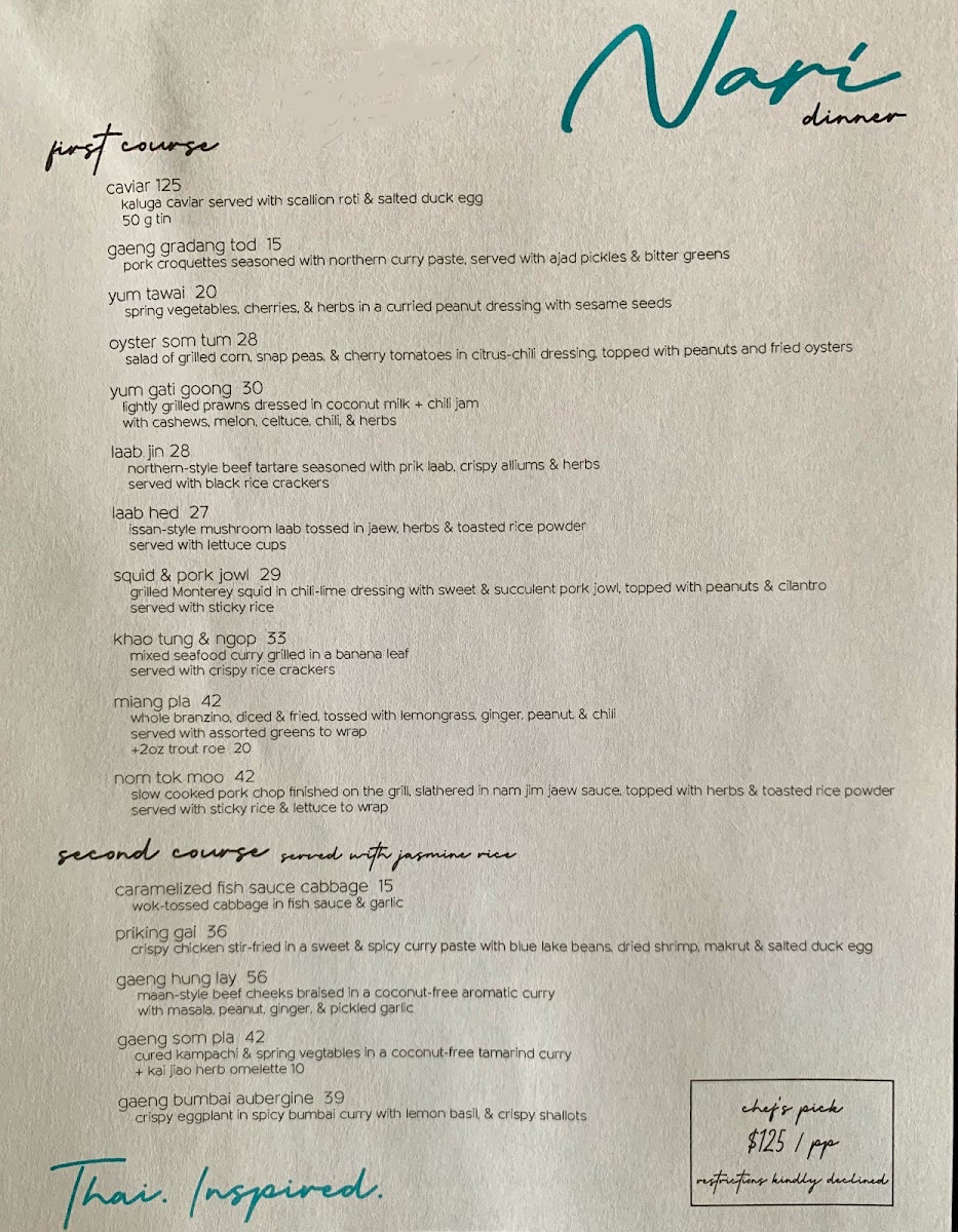 The menu at Nari offers a thoughtfully curated selection of contemporary Thai dishes designed for an evening of relaxed dining. This is not casual street food but a refined experience where bold, traditional flavors meet modern presentations in a stylish, welcoming setting.
