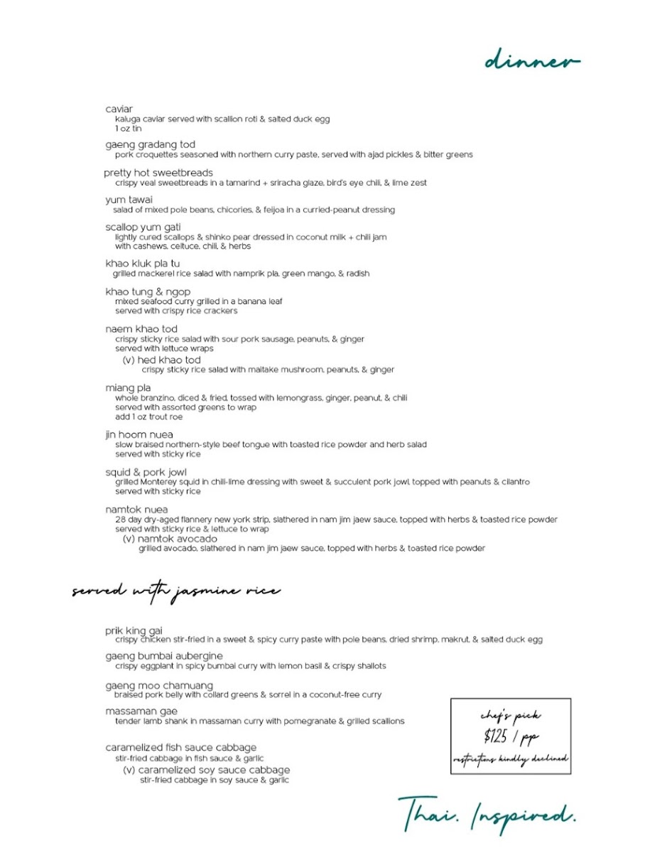 These dishes often appeal to those seeking a thoughtfully paced dinner, whether for a special night out or a meaningful meal with friends. The menu reflects both the depth of Thai cuisine and a modern dining sensibility, making it a fitting complement to the restaurant’s elegant yet approachable ambiance.